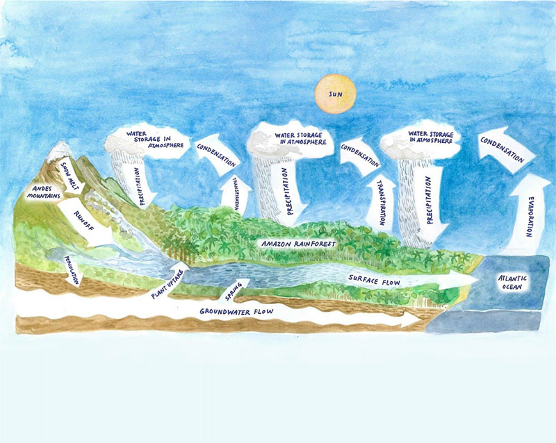 The Amazon doesn’t work like a bathtub you can drain slowly and refill later. It works like a circulatory system. Moisture enters from the Atlantic Ocean in the east, rains down, gets absorbed by the forest, evaporates back up, and travels west — creating what scientists call “flying rivers” that generate up to half of the Amazon’s own rainfall.